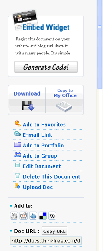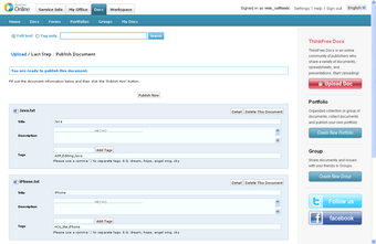 Además de crear documentos al más puro estilo Office, ThinkFree te permitirá cargar tus documentos importantes a tu espacio (dispones de 1GB como máximo). A partir de ese momento, podrás editarlos o compartirlos con otros usuarios, grupos o unirlos en tu portafolio.